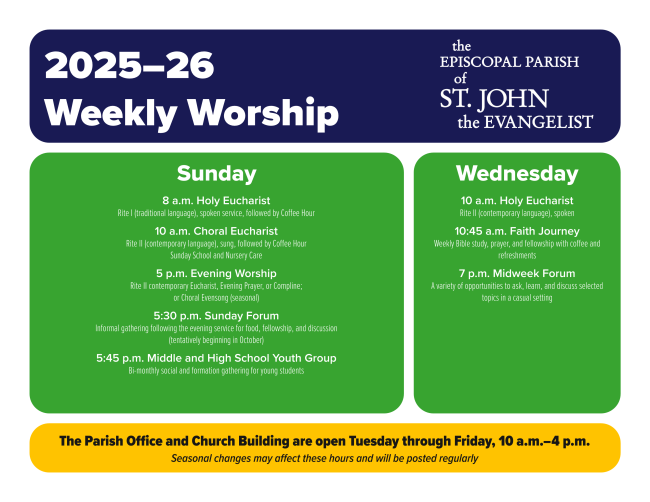 The 2025-2026 Program Year calendar is now available! The above weekly schedule outlines the regular worship opportunities at St. John’s in the fall, and the program year calendar attached below outlines major feasts, festivals, and special events. Download them, print them out, add them to your online calendars, and find a time to find what you're looking for at St. John’s this year!