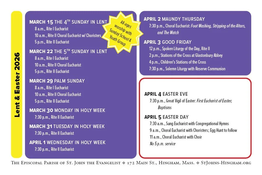 St. John’s will hold special services every evening in Holy Week, followed by the Great Vigil of Easter on Apr. 4, and 3 services on Easter morning.